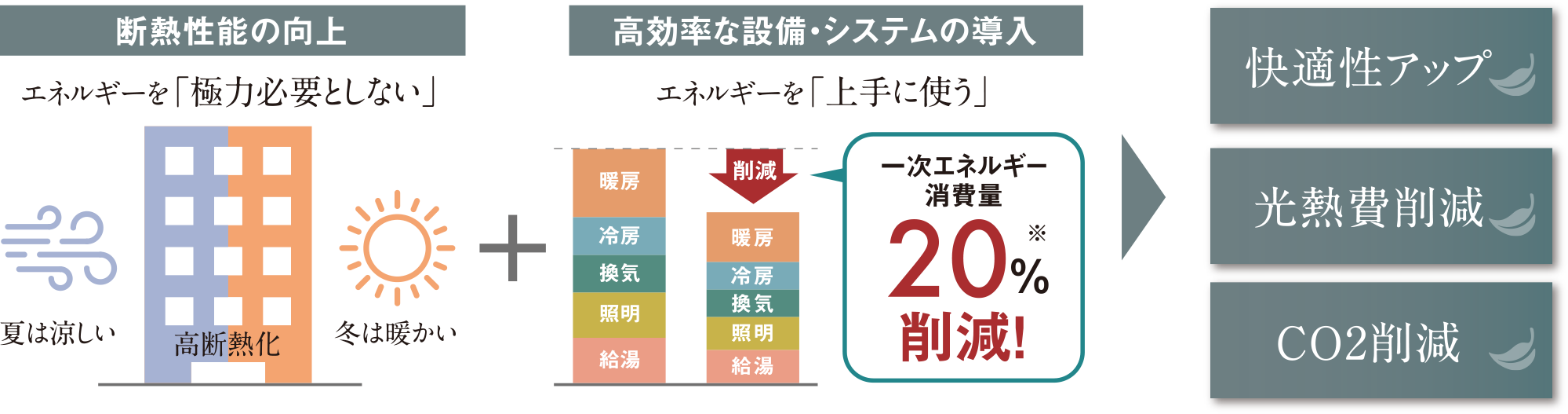省エネ法の省エネ基準に比べて、エネルギー消費量をマイナス20%以上低く抑制。