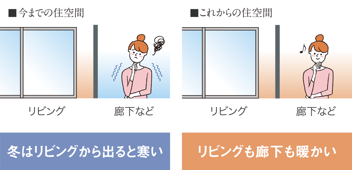 住戸内の“温度ムラ”を抑制。リビングから廊下へ出たときなどでも、暑さや寒さを感じにくくなります。