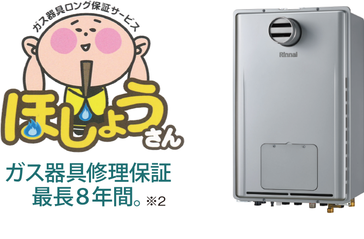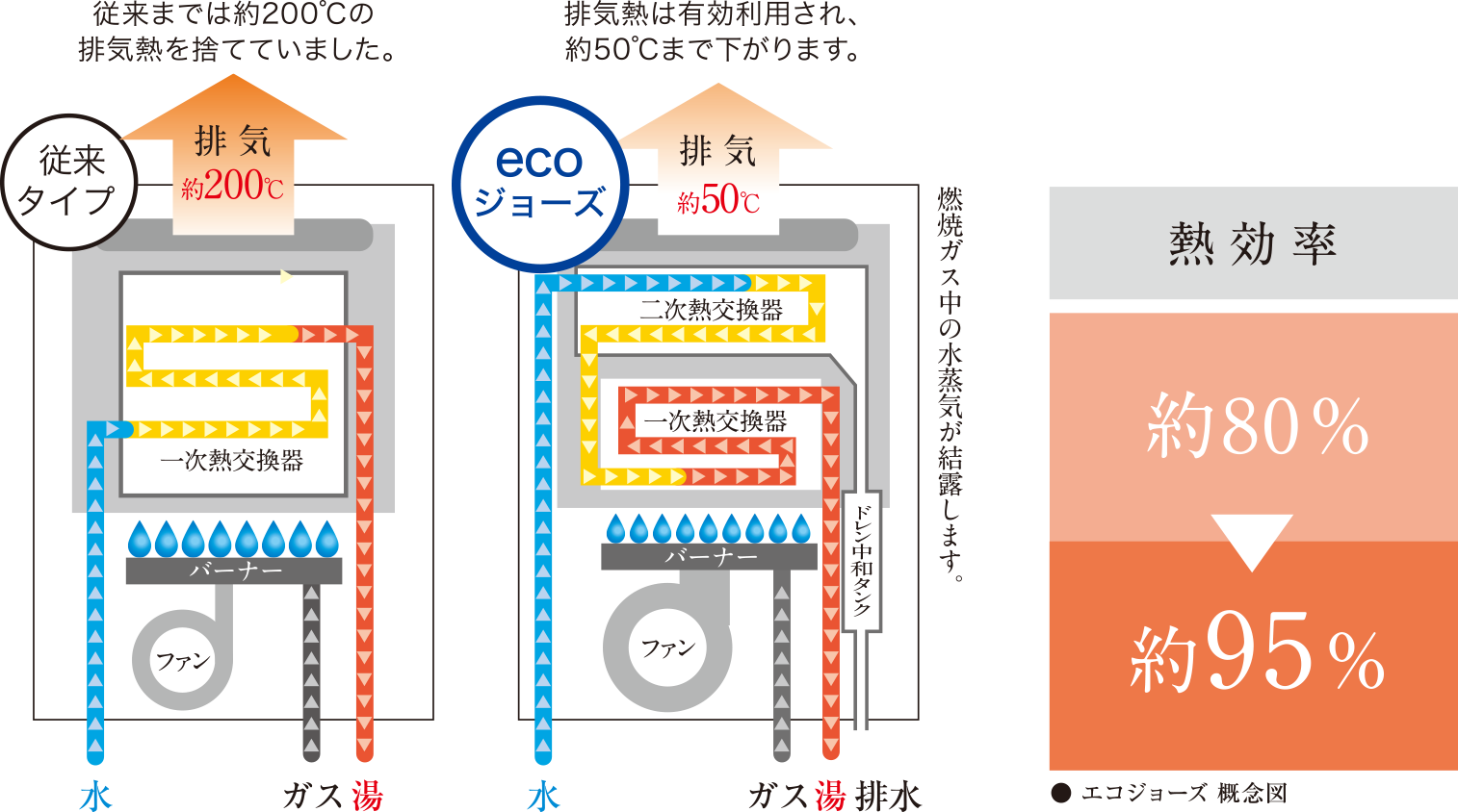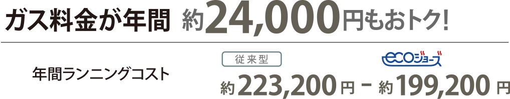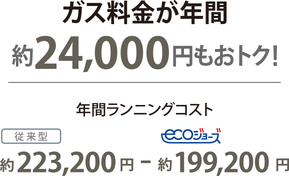エコジョーズは、今まで捨てていた排気熱・潜熱を再利用することで給湯効率を95%まで高め、CO2排出量とガス料金を大幅に削減できるようになりました。さらに、お湯をつくる能力の高い給湯器「24号」を採用しており、シャワーと給湯、洗面台や台所など、3か所以上を同時に使用することがあるご家族にも安心です。