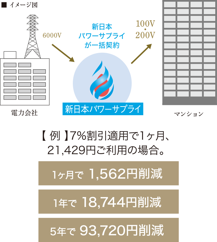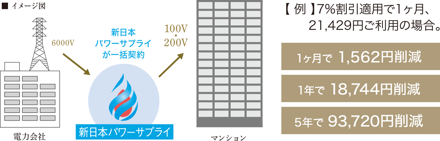 一括受電システムは、マンション建物全体をひとつの事業所とみなすことで、電力会社と高圧受電契約をむすび、料金単価差を利用することによって割安な電気を利用できる仕組みです。