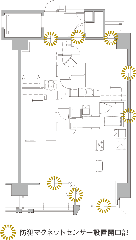 リビング・ダイニングや居室の窓等、および玄関ドアに防犯センサーを設置。(固定窓は除く)